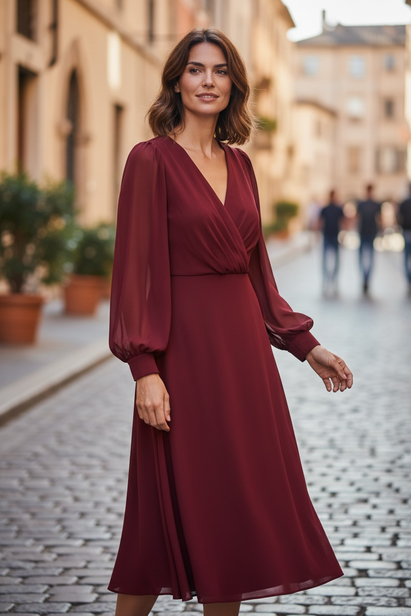 Rochie Midi Burgundy cu Mâneci din Voal